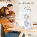 DUAL COOLING: Features dual fan system with misting capability for enhanced cooling effect and comfortable airflow distribution, REMOTE CONTROL: Comes with a convenient remote control and 1.5-metre USB cable for flexible operation and placement, LIGHTING EFFECTS: Equipped with vibrant RGB lighting displays that create an appealing ambiance while cooling, PORTABLE DESIGN: Compact and lightweight construction with carrying handle makes it perfect for various spaces including home, office, or travel