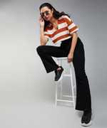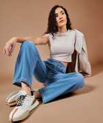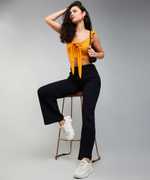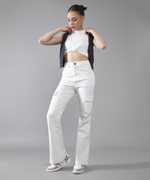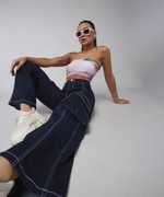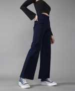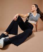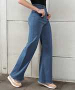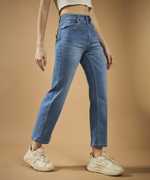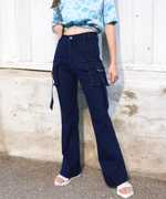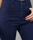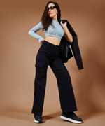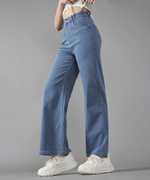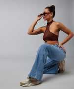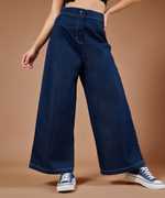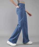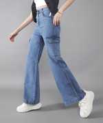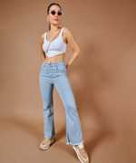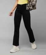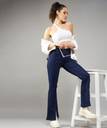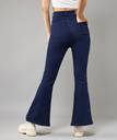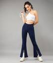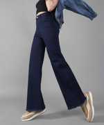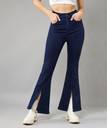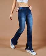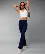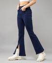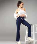 Navy Blue Bootcut High rise Clean look Regular Stretchable Denim Jeans. It has a button and zip fly closure with coin, patch and side pockets. It has a front slit.