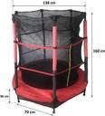 Polypropylene jumping mats made with frosted steel for durability and corrosion resistance The Safety Enclosure Netting prevents the jumper from accidentally sliding off the jump surface on the ground The frame is supported by six legs to ensure stability Highly elastic springs provide a great buoyancy on each jump. Padded protective frames and nets protect children from injury. Jumping Mat Diameter: 138 cm (54 in), Net height: 160 cm (63 in)