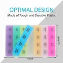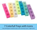 Sporting up to seven vibrant trays with icons, this pill organiser makes it easier to distinguish between different times of the day. Each tray features morning, noon, and night icons, ensuring you can track your medication schedule without any confusion. The reference prints on each tray provide a clear reminder, so you never miss a dose. The colourful design adds to the functionality, offering both visual appeal and practicality in use.