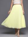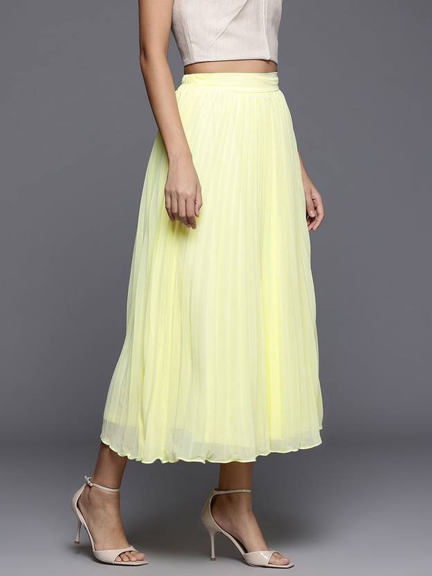Yellow solid accordion pleats midi A-line skirt, has elasticated waistband with slip-on closure, flared hem, and an attached lining
