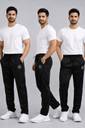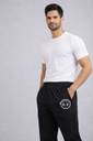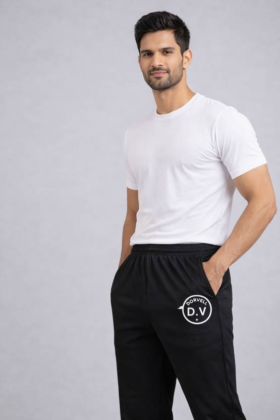 These men's black track pants are designed for comfort and style. They feature an elasticated waistband with an adjustable drawstring for a secure fit, and convenient side pockets. A distinctive white circular brand logo is prominently displayed on the left leg, adding a touch of branding. Made from a comfortable fabric, these track pants are ideal for casual wear, gym workouts, lounging at home, or any athletic activity. Pair them with a simple t-shirt, a casual hoodie, or a sports jacket for a complete look. They are also compatible with various types of athletic footwear like sneakers or running shoes.
