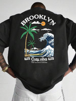 Adding a distinctive touch to everyday style, this men's T-shirt features a bold print complemented by beach waves, coconut trees and a sunset. The design brings an urban and coastal blend, making it an easy choice for those who appreciate a mix of city and nature-inspired fashion.