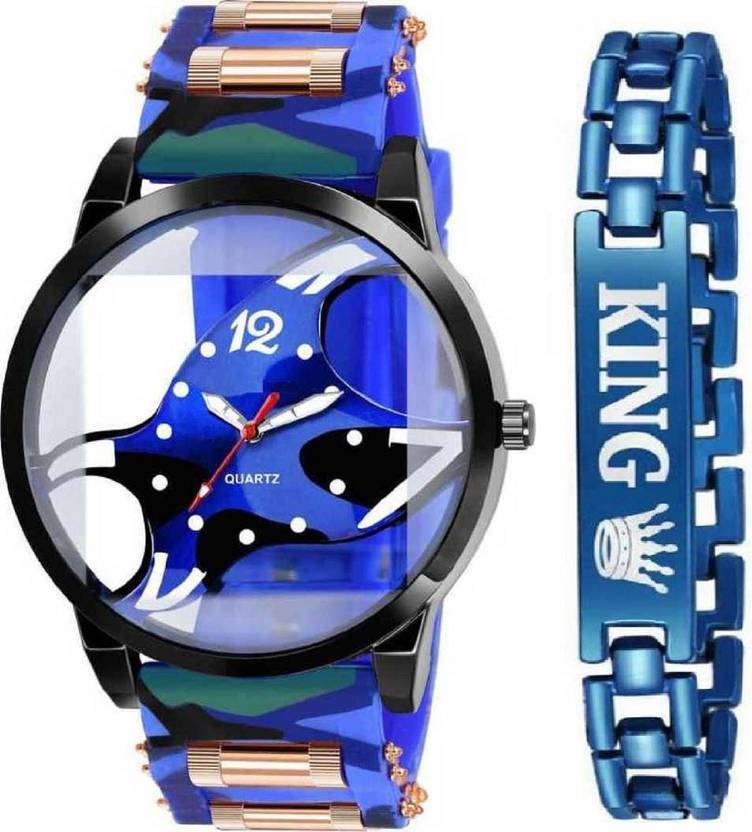 DT-036 NEW STYLISH BLUE TRANSPARENT DIAL AND KING BRACELET COMBO WATCH FOR BOYS AND MENS