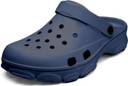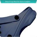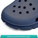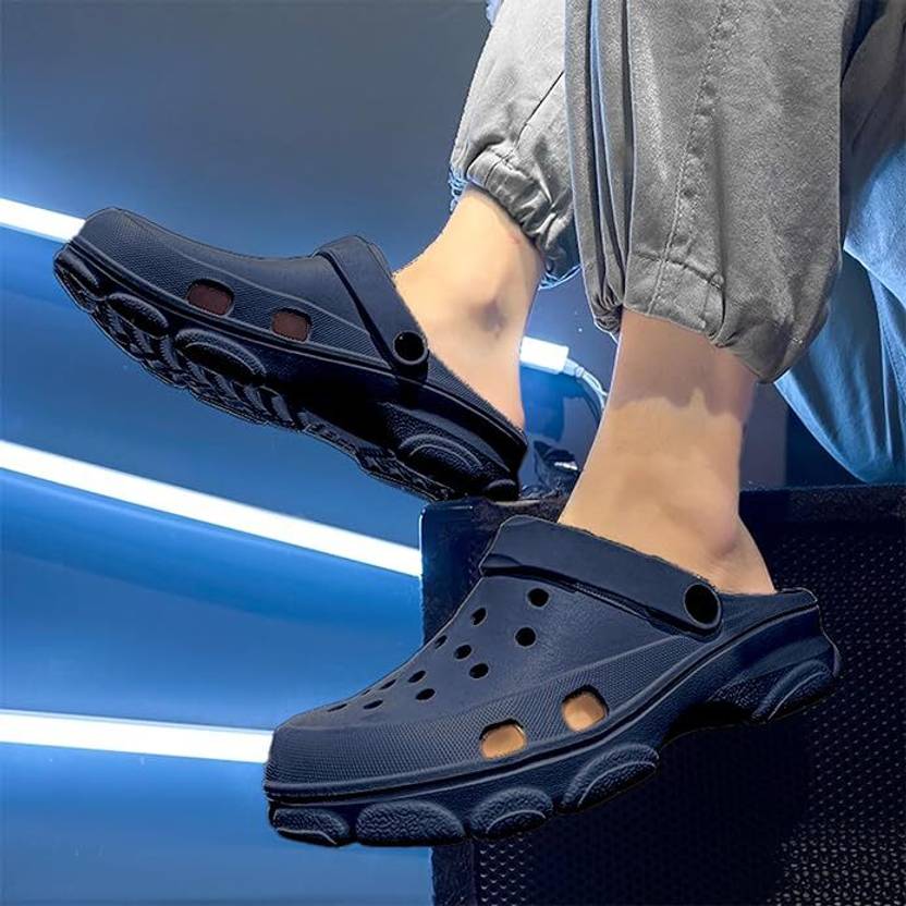 These navy blue slip-on clogs/sandals are crafted from a waterproof and breathable material, likely EVA, ensuring comfort and durability. The upper features multiple perforations for enhanced ventilation and quick drainage, making them ideal for wet conditions. Designed for ease of wear, they include an adjustable heel strap that can be worn up for a secure fit or pushed forward for a slip-on style. The deep U-cup heel design provides extra comfort and support. The robust sole is textured for improved grip and stability. These versatile sandals are perfect for various casual activities such as beach outings, gardening, poolside wear, or simply as comfortable house slippers. They can be effortlessly paired with casual attire like shorts, casual pants, swimwear, or loungewear.