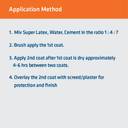 (2)AREA OF APPLICATION - As a bond coat - plaster to plaster, concrete-to-concrete, plaster to concrete masonry to stonework and for plastering over brick masonry. As waterproofing – Waterproofing of small roof terraces, sunken portions of toilet & bathrooms, chajjas & lift pits, balconies & stair cases. As crack repair - Repairs of plaster cracks more than 5 mm & in gaps developed between masonry and RCC members. For Cladding – fixing or refixing of slip bricks, tiles, stones & marble bedding.