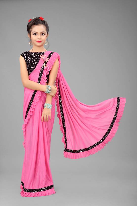 Fabric: Appears to be made of a soft, flowing synthetic fabric like lycra giving it a smooth drape ideal for kids. Border & Pallu: The saree features a ruffled border trimmed with a black ribbon, adding a trendy and youthful flair. Blouse: The blouse is black with shiny sequin work all over, perfectly complementing kids saree. It adds a festive and sparkly element. Accessories: The look is completed with turquoise bangles, hoop earrings, and a pink floral brooch on the pallu, enhancing the overall charm. Ideal for: Birthday parties, weddings, festive events, traditional functions Included: Pre-stitched saree with blouse – easy to wear, perfect for kids Sizes Available: Suitable for girls aged age range, e.g., 3–12 years