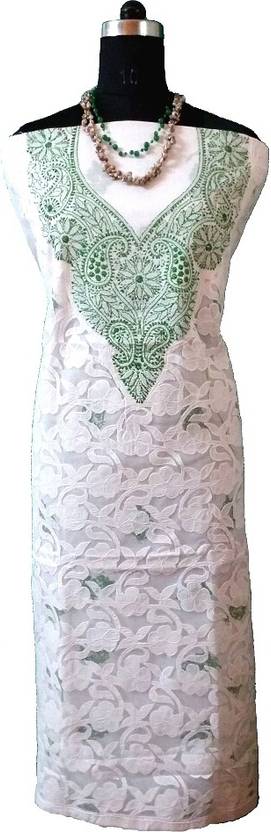 2.75 mt White cotton Kurta fabric,Crafted with green color thread.