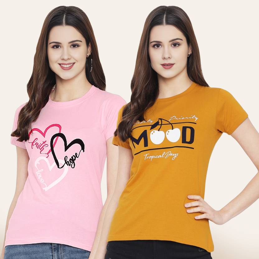 DreamBe Pack of 2 Women Printed Round Neck Pure Cotton Multicolor T-Shirt