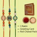 3 Rakhi, 1 Chawal Roli Pack, 1 Greeting Card