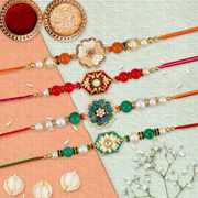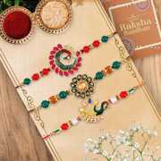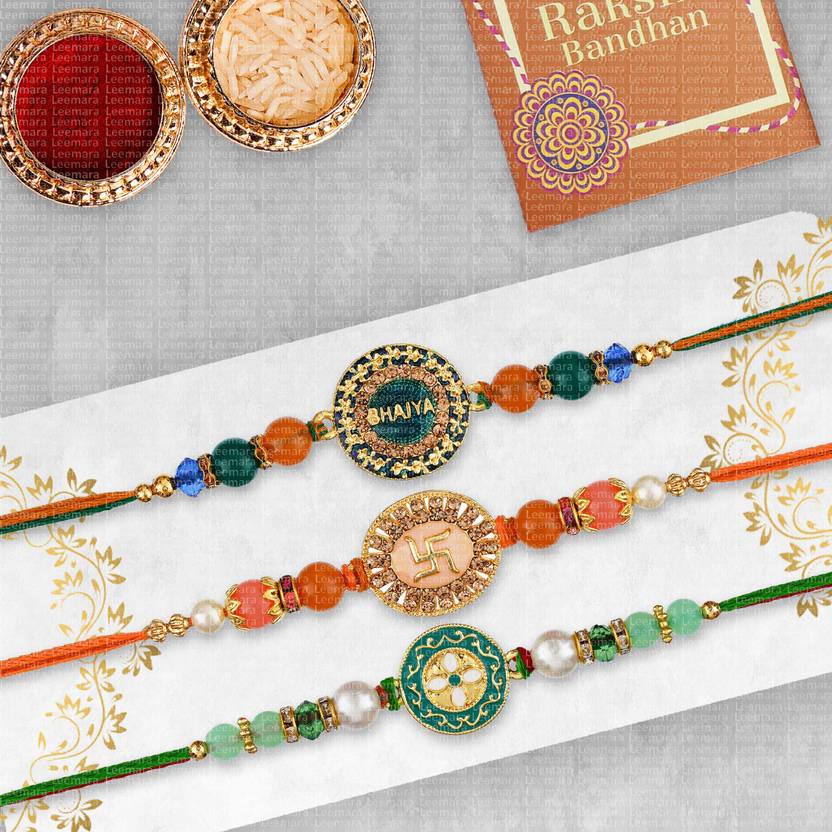 On this Rakshabandhan, send your brother this wonderful and fabulous looking designer rakhi and express your love. It makes your smart and cool brother feel more special on this special day. No matter how far you are, raksha bandhan always brings back the happy memories you had together with your beloved brother|Package Contains : 3 Rakhi, 1 Roli Chawal Pack, 1 Best Wishes Greeting card |Superior Quality & Skin Friendly Rakhi: We ensure top quality experience making our Rakhi 100% Skin Friendly. It has been made from toxic free materials Anti-Allergic and Safe for Skin. It can be worn over long time periods without any complains of ach and swelling. Made from Premium Quality Mauli Thread, Kundan, Gold Finish, Pearl, Silver, Metal which assures to remain in its Original Glory even after months of usage |Design: The rakhi has been Traditionally and exclusively designed by the LEEMARA and is handcrafted by artisans across India. The design of the delivered Rakhi are same as it is shown in the image |100% Genuine Quality Product.