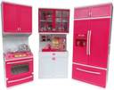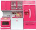 dreamworld brings you a Kitchen Play Toy Set is great for children to take on the role of cooks and have a fun play time. Kids can replay and imitate the real world kitchen scenario with this Toy Set. . This cute kitchen set is bound to make your little princess happy. The realistic looking set is ideally suited for girls of three years and above. Your kid will get ideas to organize a kitchen and learn how kitchen chores are done. It is a Battery Operated Play Set (batteries are included) in which pushing the knob on the stove-top emits a whistling sound with light. The toy appliances like the refrigerator, kitchen sink cabinet, fruits rack, tableware, dining set, gas stove with frying pan and cooker, microwave oven, wall cabinets will all add to the feel. Every item except the utensils is fixed. You can pretend play to wash the utensils in the sink or serve fruits from the fruits rack in tableware and dining set. Or you can get a chilled drink with ice cubes with the refrigerator included and cook a meal with oven and cooktop. Watch your little doll busy playing with this delightful kitchen set along with her friends.
