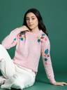 Women Embroidered Round Neck Pink Sweater