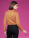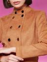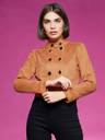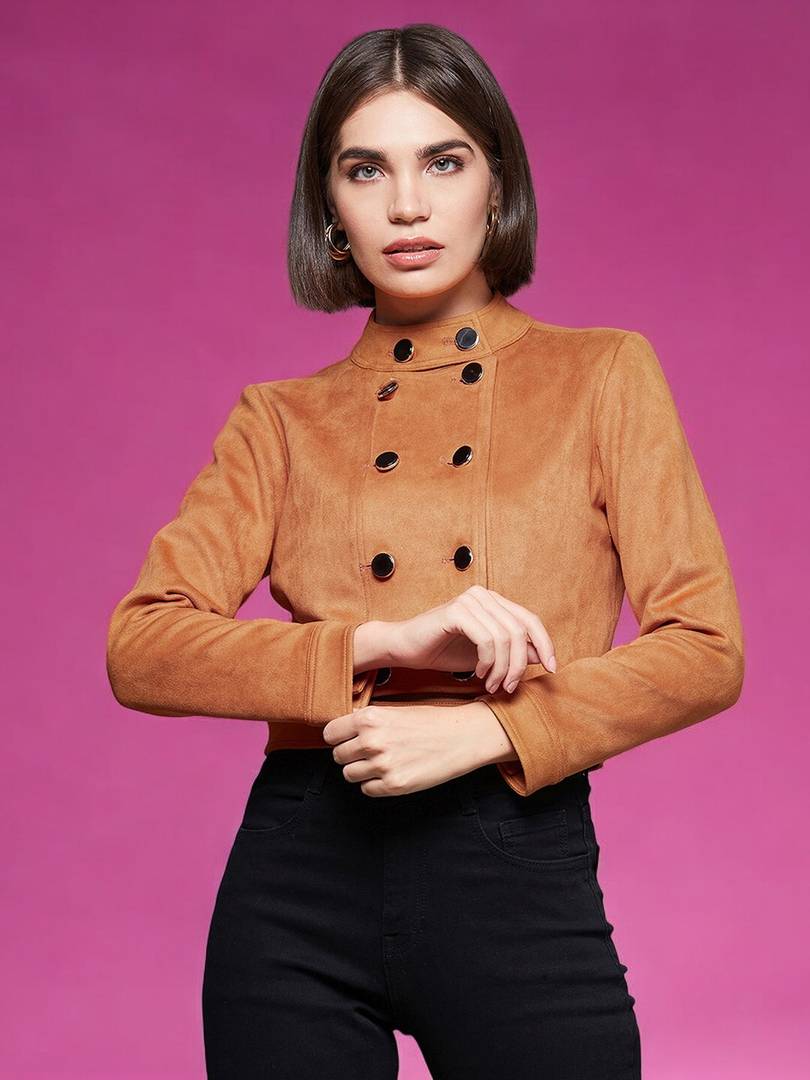Burnt Orange Colored Short-Length Double Breasted Mandarin Collared Polyester Jacket. It Has 2 Side Pockets And Buttoned Detailing. It Has Zip Closure.
