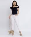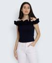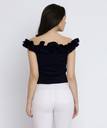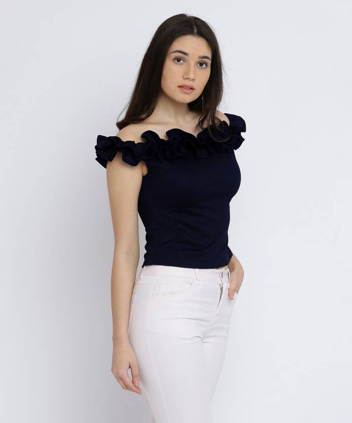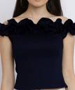 Navy Blue solid ruffled gathered frilled Bardot top, Is off shoulder and sleeveless, Has a zip closure