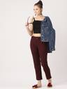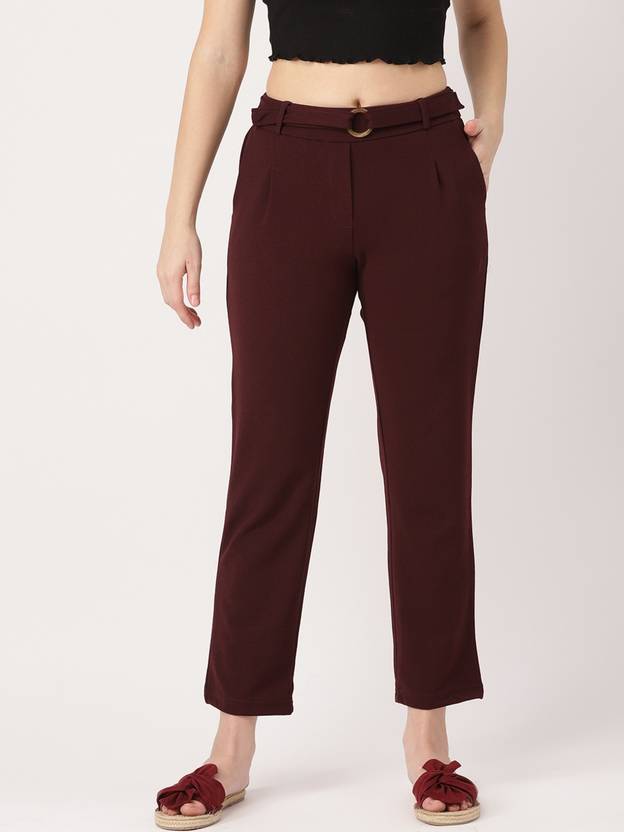 Burgundy solid mid-rise cropped trousers, has a partially elasticated waistband with slip-on closure, and 2 pocketsComes with a belt. These breathable DressBerry trousers will keep you comfortable all day long. Match this solid burgundy pair with a classic leather jacket and some ballerinas when you're going to a concert or comedy show.
