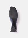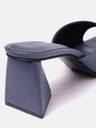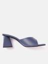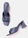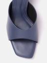 A pair of navy blue open toe heels, has regular ankle and open back Synthetic solid upper Cushioned footbed Textured and patterend outsole, has a block heel Warranty: 1 month Warranty provided by Brand Owner / Manufacturer