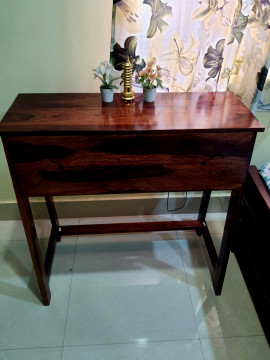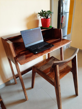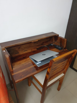 Lovely solid wood table. Perfect for small spaces. A chair with arms may/may not fit as the table sits low as compared to normal tables. It fits in my case for a chair with arms when the table is open...more