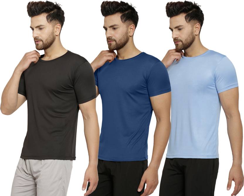DRIZONE Pack of 3 Men Solid Round Neck Polyester Black, Dark Blue, Light Blue T-Shirt