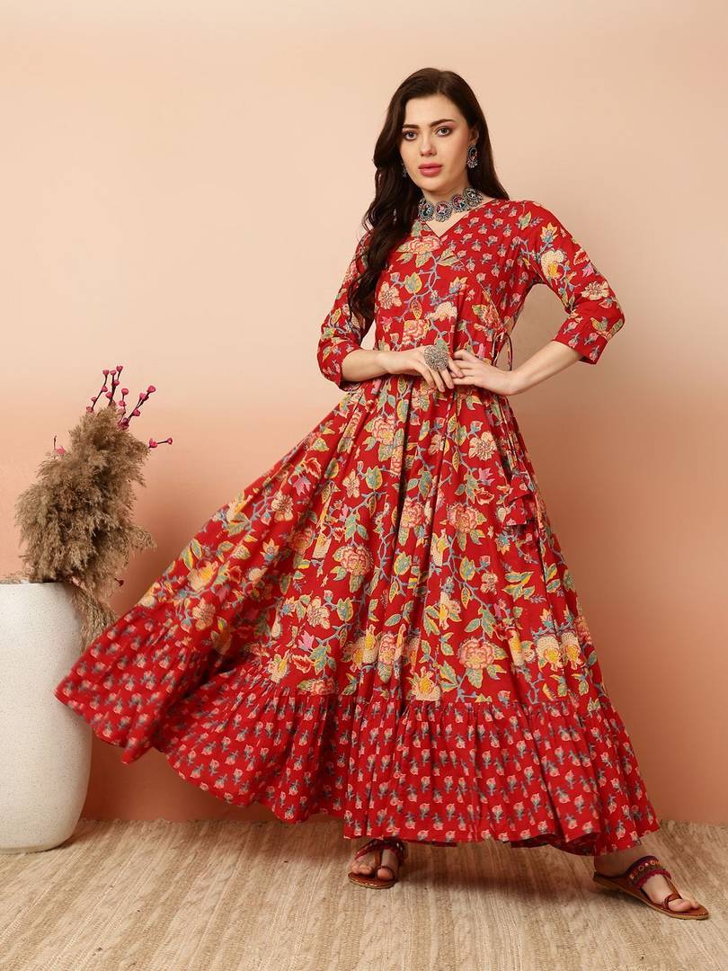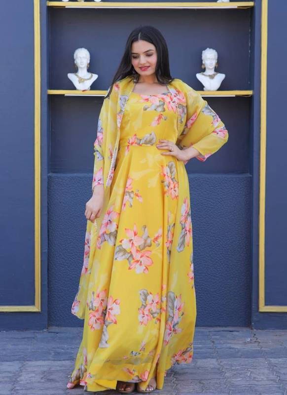 Brighten your festive wardrobe with this radiant yellow Anarkali gown from FROM DRJ. Crafted in premium georgette fabric with a soft crepe inner lining, this elegant ensemble features vibrant floral prints that bring a fresh and feminine charm. Its ankle-length flare adds a graceful flow, making it ideal for daytime celebrations, haldi functions, or casual ethnic wear.