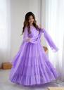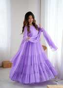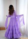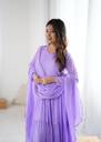 Elevate your ethnic wardrobe with this elegant Aqua Lavender Anarkali Gown, beautifully designed in soft georgette fabric for a flowy and graceful drape. The solid design adds timeless sophistication, making it a perfect choice for festive occasions, parties, weddings, and family gatherings. Featuring a stylish paan neck and full sleeves, this gown offers a chic yet modest look. The ankle-length flare gives it a royal finish, while the crepe inner lining ensures comfort and ease of movement all day long. To complete the look, it comes with a matching dupatta finished with delicate border detailing, adding an extra touch of elegance. Available in sizes M, L, XL, and XXL, this gown is designed to flatter every body type. Please note, no bottom wear is included in the package.