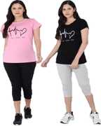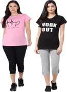 Soft cotton fabric that is sure to give you that extra comfortable when relaxing at home. You can choose to wear it as it is or team it up with your capri. Half sleeves top with round neck and printed brings you refreshing feel for your nights. capri and Elastic waistband with a drawstring.