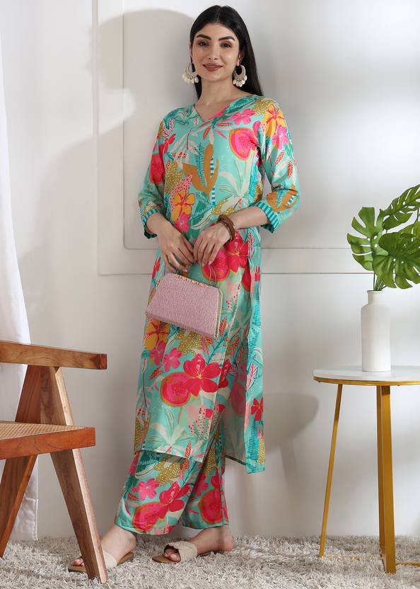 Fabric: Soft and breathable poly rayon, Design: Stylish floral print with vibrant multicolor pattern, Set Includes: Long kurta with matching palazzo pants (2-piece set), Kurta Length: 44 inches | Palazzo Length: 37 inches, Sleeves: 3/4 sleeves, Occasion: Perfect Cord Set for festive wear, casual outings, or office.