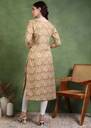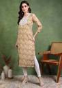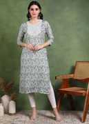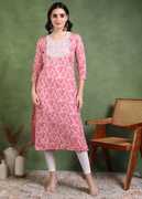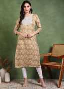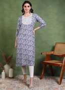 This women's printed kurti is made from soft and lightweight Poly Rayon fabric. It features a beautiful geometric design with an embroidered yoke, a round neckline, and 3/4th sleeves. Perfect for casual, office, or festive wear, it offers a comfortable fit and is available in sizes S, M, L, XL, and XXL. Pair it with leggings or palazzos for an elegant look.