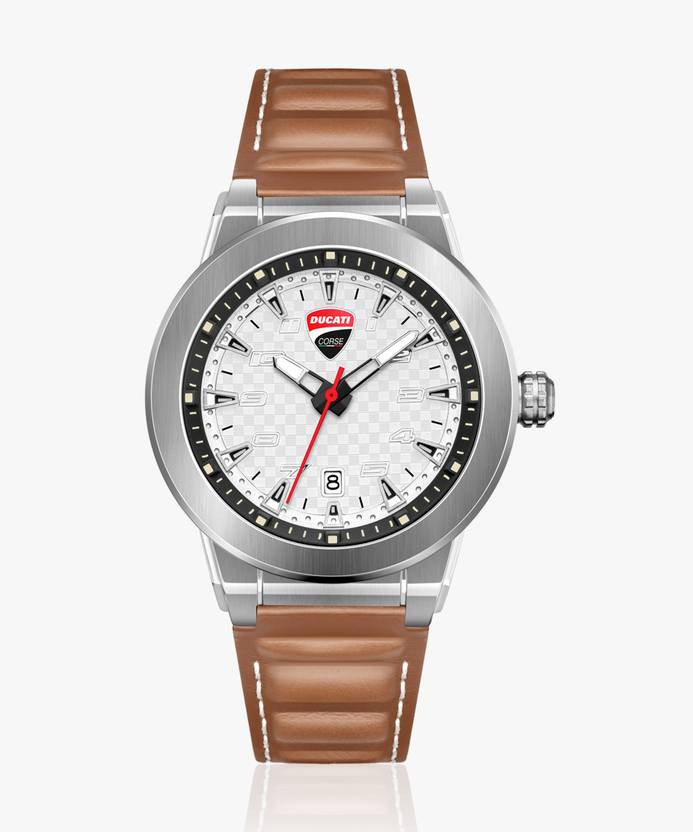 Ducati brand is brought alive in the watches by using the iconic Ducati Shield (Logo) at a prominent position on the dial and also etching the word ‘DUCATI’ on the case of the watch. Ducati as a brand stands for racing and is a fierce and successful competitor in the racing circuits of the world. This inspiration is brought alive in the curved, smooth design of the case and with the use of carbon fibre dials.