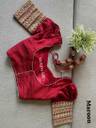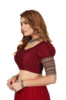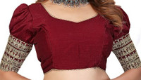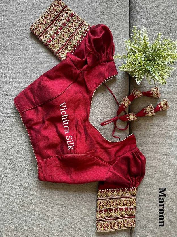 Made from silk, this blouse has a smooth texture that feels luxurious to the touch. It includes a soft inner lining that helps maintain comfort throughout the day, making it suitable for long hours of wear during celebrations or gatherings. The fabric’s natural breathability and lightweight quality add to its ease of wear.