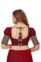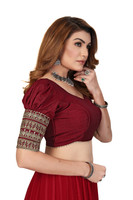 Thanks to its structured fit, this blouse gently shapes the body while providing a tailored drape that feels graceful. The sweetheart neck creates a soft and flattering silhouette, complemented by half-puff sleeves that add volume and traditional charm. This blouse also includes a back hook closure and tasselled strings that allow subtle adjustment. Soft padding in the cups offers gentle support without compromising comfort.