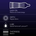 With these Durex Mutual Climax Condoms, you and your partner can enjoy mutual pleasure that will leave lasting memories. The Performa lubricant is used to help the man slow down and a ribbed and dotted design is used to speed up the woman. This way, both of you can enjoy an in-sync connection. The easy-on shape provides a comfortable and proper fit so that there are no distractions or interruptions while being intimate. You and your partner can enjoy reliable and protected use with these condoms as they are dermatologically tested. Disclaimer: While we work to ensure that product information is correct, on occasion manufacturers may alter their ingredient lists. Actual product packaging and materials may contain more and/or different information than that shown on our Website. We recommend that you do not solely rely on the information presented and that you always read labels, warnings, and directions before using or consuming a product.