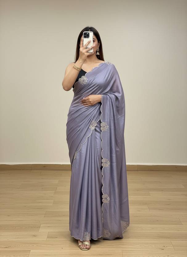 Solid/Plain, Embroidered Bollywood Chiffon Saree (Blue)