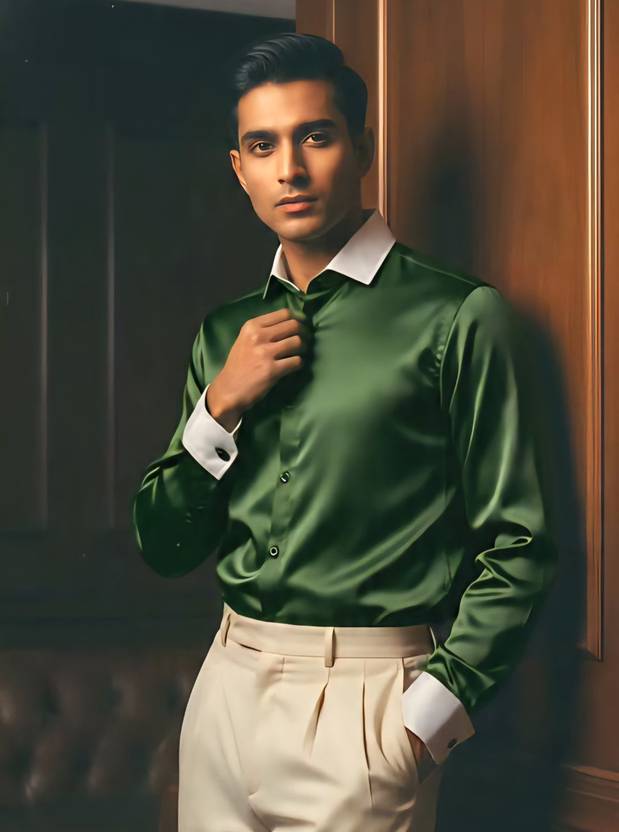 This long-sleeved shirt features a striking contrast design with a black body and crisp white collar and French cuffs. Crafted from a smooth, lustrous fabric, it offers a sleek and sophisticated look. The shirt has a full button-down front and a regular fit, making it suitable for various dressy occasions. It is paired here with light-colored pleated trousers.