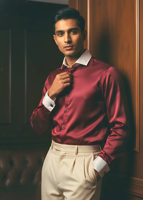 This long-sleeved shirt features a striking contrast design with a black body and crisp white collar and French cuffs. Crafted from a smooth, lustrous fabric, it offers a sleek and sophisticated look. The shirt has a full button-down front and a regular fit, making it suitable for various dressy occasions. It is paired here with light-colored pleated trousers.