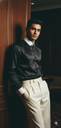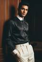 This long-sleeved shirt features a striking contrast design with a black body and crisp white collar and French cuffs. Crafted from a smooth, lustrous fabric, it offers a sleek and sophisticated look. The shirt has a full button-down front and a regular fit, making it suitable for various dressy occasions. It is paired here with light-colored pleated trousers.