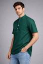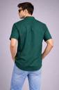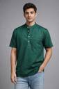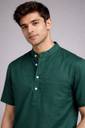 Solid deep green kurta-style shirt with mandarin collar, half button placket, short sleeves, and chest pocket. Made from soft breathable fabric for lasting comfort.