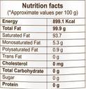 Nutrient Content | - Energy: 899.1 Kcal, Total Fat: 99.9 g, Cholesterol: 0 mg, Total Carbohydrate: 0 g, Sugar: 0 g, Protein: 0 g