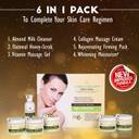 1. Almond Milk Cleanser :- This nutrients rich cleanser is most suited to mature skin, It penetrates & remove deep suited impurities, Hydrolyzed milk keep the skin supple & moist, The almond oil helps dissolved accumaled melanin to make the skin fairer & firmer 2. Oatmeal Honey Scrub :- This gentle scrub enrich with nourishing oatmeal powder draws out impurities, unclog pores & removes dry dead cells from surface of your skin. Honey helps replenish the lost moisture. The blend of almond oil & jojoba oil helps reverse signs of ageing. 3. Vitamin Massage Gel :- This unique massage gel enriched with aloe juice helps to reduce wrinkles and fine lines effectively on regular use, The blend of silicone & aloe juice lightens & tightnes the ageing of skin, Vitamin E further replenishes the skin & gives younger look. 4. Collagen Massage Cream :- This unique cream enriched with almond oil, olive oil, vitaminB3 & neroli oil penetrates deeply inside the skin & moisturies the mature skin. The combination of collagen extract, vitamin A & vitamin C prevents & reverses the signs of ageing by penetrating further deeper into layer of dermis & showing visible effects on wrinkles. 5. Rejuvenating Firmimg Pack :- This natural face pack enriched with olive leaf extract is most effective on mature skin, The goodness of minerals from earthen soil procvides firmness & tightening effect along with adding bright mineral glow to the skin, The combinations of sweet basil oil, hazelnut extract & lavender oil helps suppressing the fine lines & wrinkles. 6. Whitening Moisturier :- This special moisturiser enriched with eurol BT & vitamin E adds fairness & tightens the skin combination of patchouil & rosemary works with skin's natural mechanisum to even out skin tone & build moisture level, Unique blend of natural UV screening agents protects the skin from pollutants.