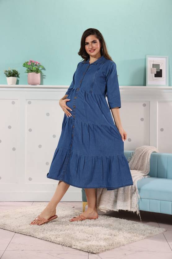 Featuring a solid pattern, this women’s maternity dress presents a high, empire waistline that gathers just below the bust, comfortably accommodating a growing belly. The calf-length skirt incorporates a tiered A-line structure with two ruffle tiers, creating a graceful, flowing silhouette. A collared neckline with a button-up front and three-quarter sleeves completes the structured, elegant look, offering a composed and versatile aesthetic.