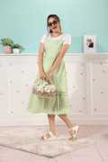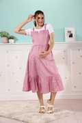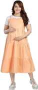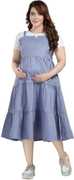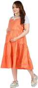 Sporting an overall-inspired aesthetic, this dress incorporates thin straps and a notched square neck that visually suggests a layered look. The tiered knee-length skirt contributes to a flowing, flared silhouette, with tie-up detailing at the back. The combination of sleeveless design, notched neckline, and tiered cut provides a balanced look that is both comfortable and structured, supporting versatility from casual to semi-formal occasions.
