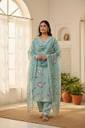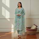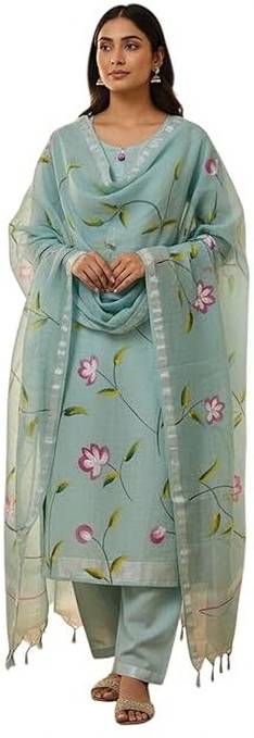 The set includes a hand-painted linen top, a matching dupatta with a shimmering silver zari border, and a comfortable cotton bottom fabric—perfect for custom tailoring. Whether it’s festive wear, office functions, family gatherings, or casual outings, this suit set adds sophistication to every occasion.