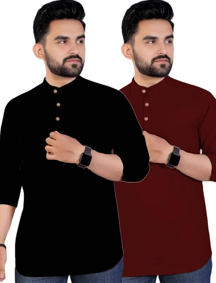 indirae Pack of 2 Men Solid Cotton Blend A-line Kurta (Maroon)