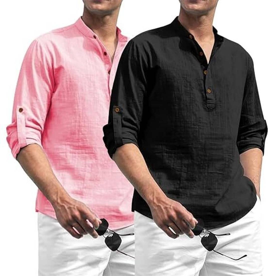 Men Solid Cotton Blend Straight Kurta (Light Blue, Black)