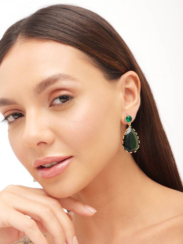 These earrings feature elegant teardrop-shaped designs adorned with captivating emerald green crystals. The luscious hue of the crystals evokes the serene greenery of a lush forest, adding a touch of vibrance to your look. Versatile enough for both casual outings and formal occasions, these earrings are the perfect complement to any outfit.