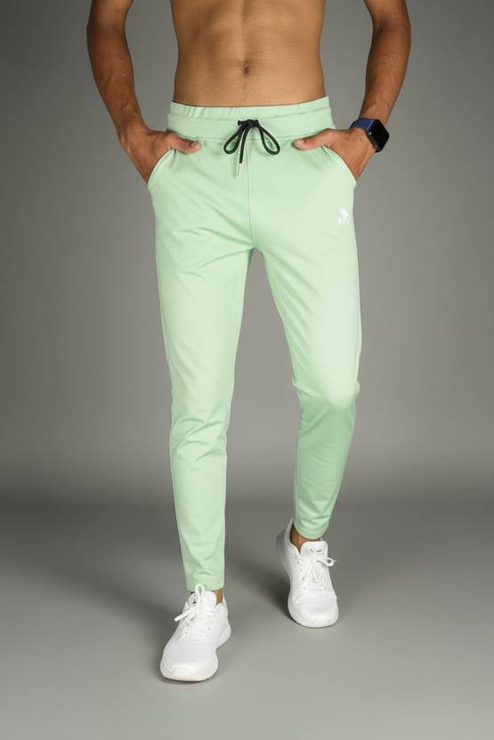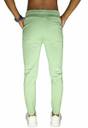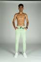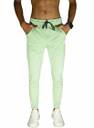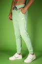 The image shows a person wearing light green jogger pants. The joggers have a drawstring waistband in a contrasting darker color and side pockets. A subtle logo is visible on the upper thigh area of the left leg. The person is also wearing white athletic sneakers and a smartwatch. The background is plain white, and only the body from the waist down is visible, with hands placed in the pockets.