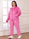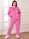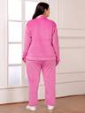 This is a comfortable pink velvet night suit, perfect for lounging or sleeping. It features a full-zip jacket with a collar and long sleeves, paired with matching full-length pants that have an elasticated waist for a relaxed fit and convenient pockets. The soft velvet material provides a cozy feel. This night suit would be compatible with comfortable slippers or an eye mask for a complete sleepwear ensemble.