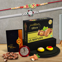 The Rakhi combo features a chocolate box with choco almonds. These chocolates are intended to add a sweet touch to the celebration. The quality chocolates included aim to provide a luxurious experience. They are chosen for their rich taste and intended to complement the festive mood. The combination of chocolates with the Rakhi set hopes to create a delightful gift for your sibling.