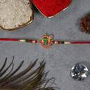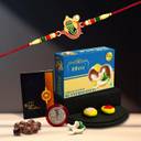 Featuring a collection that includes a rakhi, roli and chawal, a greeting card, a pooja coin, and a butterscotch chocolate box, this rakhi set brings together the elements needed for a heartfelt celebration. The rakhi carries traditional charm, while the roli and chawal are included for the tilak ceremony. The greeting card provides space to share personal messages. In addition, the coin, imprinted with images of Goddess Lakshmi and Lord Ganesha on one side, carries symbolic meaning and festive significance. The chocolate box offers a sweet touch to complete the gesture.