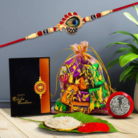 Courtesy of its thoughtfully curated contents, this rakhi set includes all the essentials for a heartfelt celebration. It features a beautifully crafted rakhi, a greeting card to share personal messages, and a chocolate treat to sweeten the occasion. Also included are a symbolic coin, rice, and vermilion, key elements for performing the traditional Raksha Bandhan ritual. Together, the items create a meaningful way to uphold customs while celebrating the special bond between siblings.